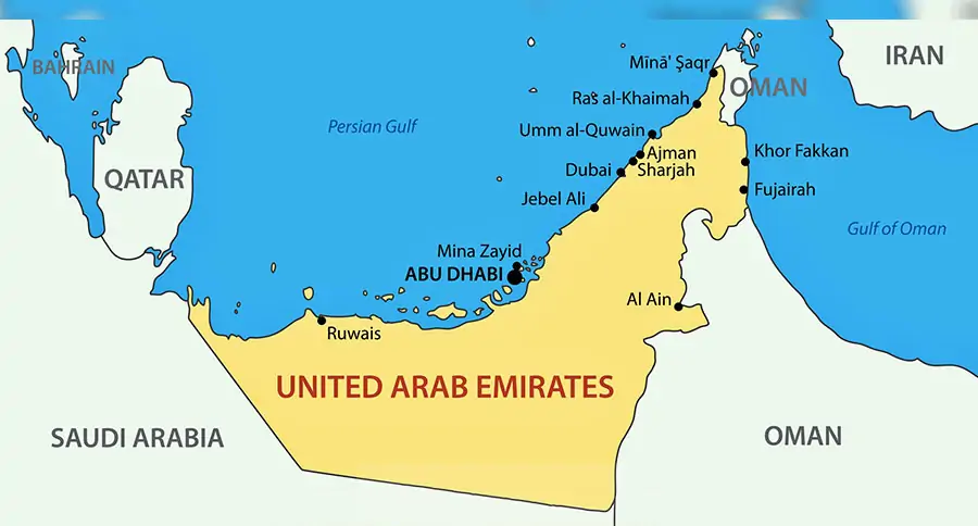 امارات متحده عربی یک کشور پادشاهی در جنوب غرب آسیا و بخشی از منطقه خاورمیانه است. این کشور در قسمت شرقی شبه جزیره عربستان در سواحل جنوب شرقی خلیج فارس و ساحل شمال غربی خلیج عمان قرار گرفته است. کشور امارات از جنوب و غرب با عربستان سعودی، از شرق با عمان و از شمال با خلیج فارس همسایه است.